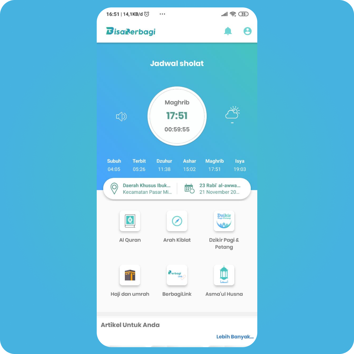 App feature : Prayer schedule, Al-Quran, Qiblat Direction, Morning and evening adzkar, Asmaul-Husna, BerbagiLink